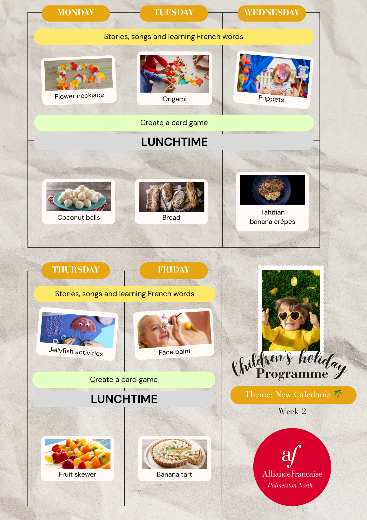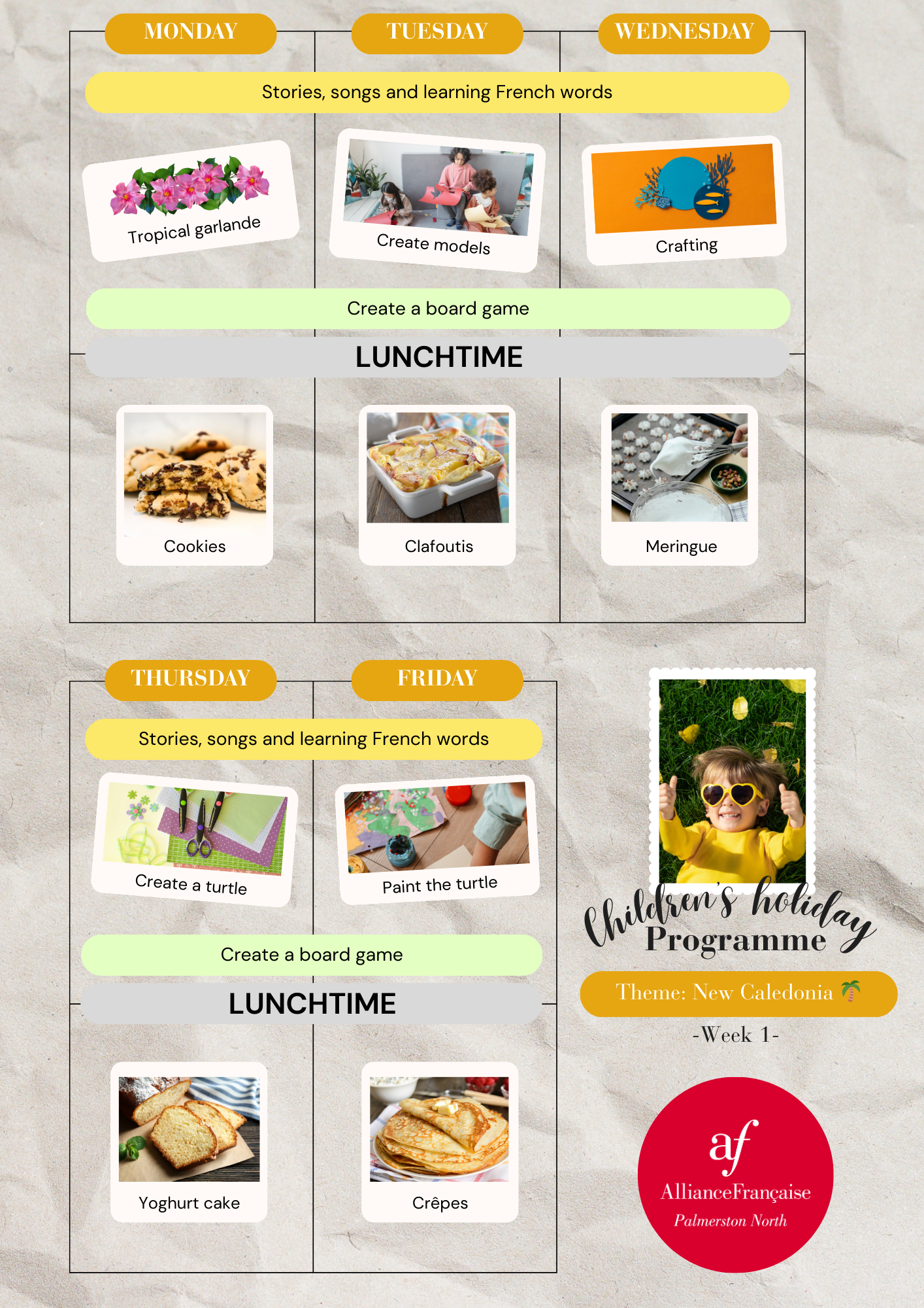 Activities run at the Alliance Française Palmerston North studio from 9 am to 3 pm. Children welcome