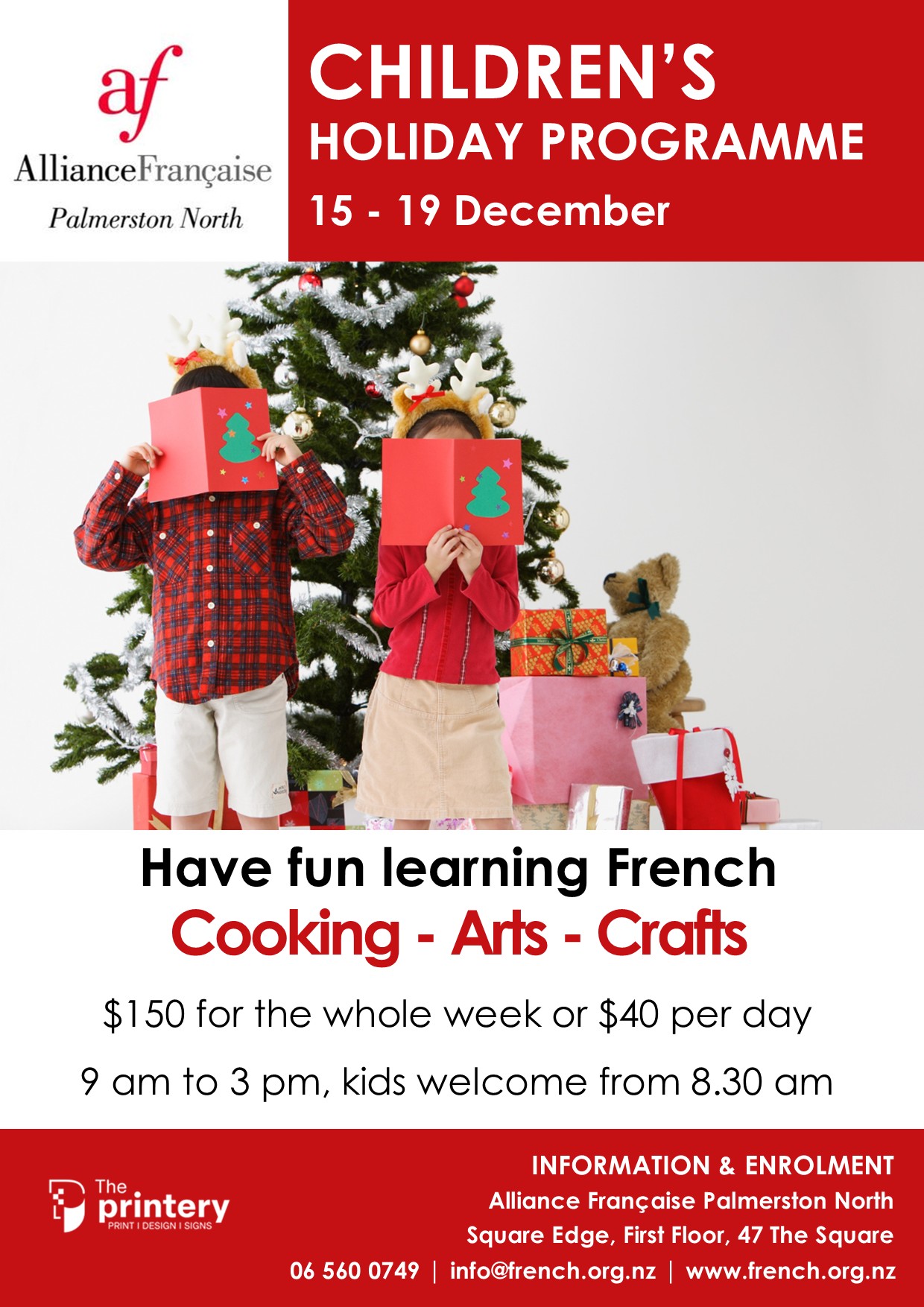 Activities run at the Alliance Française Palmerston North studio from 9 am to 3 pm. Children welcome